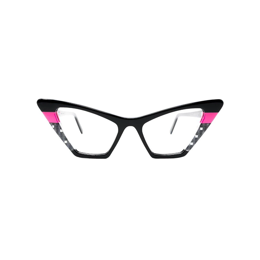 Montatura da vista che rappresenta la rivisitazione “estrema” dell’iconico modello “cat-eye”; occhiale caratterizzato da angoli accentuati che lo rendono perfetto per chi non vuole passare inosservato.